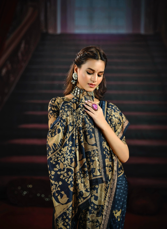 Stunning Navy Blue Saree with Rich Gold Animal ...