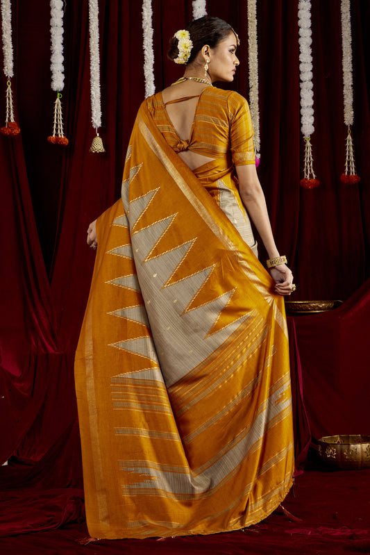 Mustard and Beige Pure Silk Saree with Zigzag a...