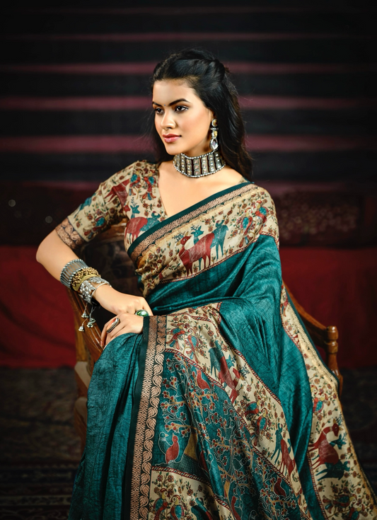 Vibrant Teal-Blue Saree Featuring Traditional A...