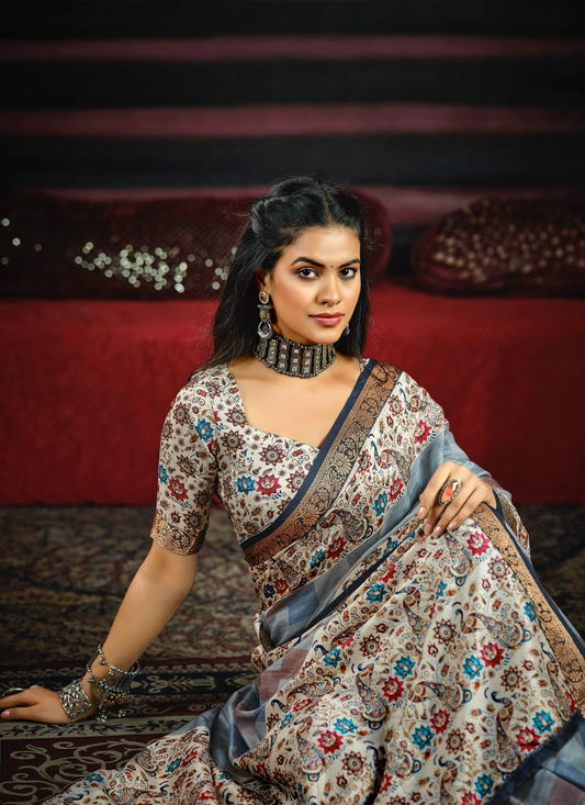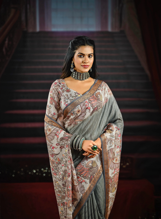 Timeless Grey Saree with Subtle Multicolor Chec...