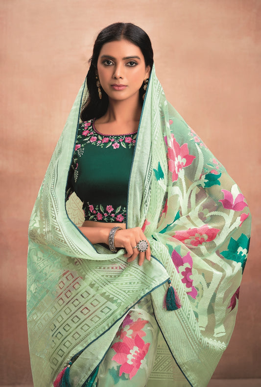 Sea Green Organza Saree with Digital Floral Pri...