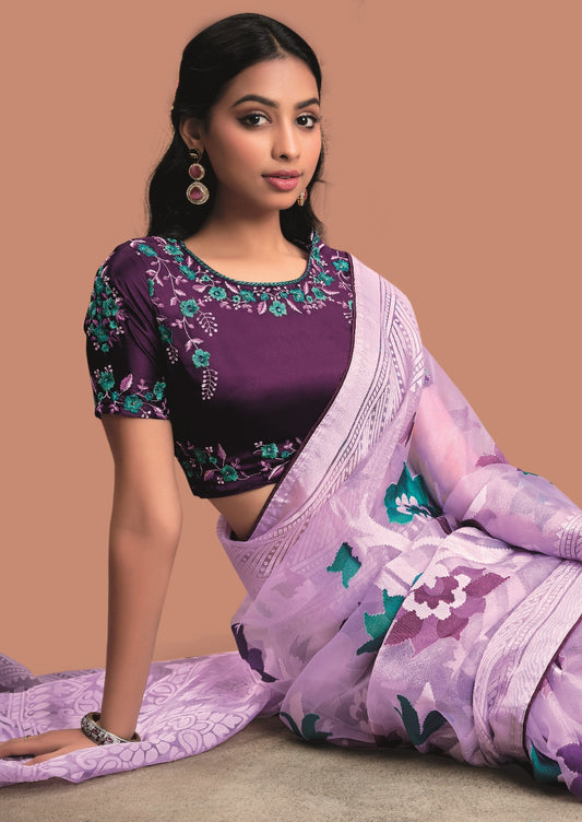 Lavender Pure Organza Saree with Digital Print ...