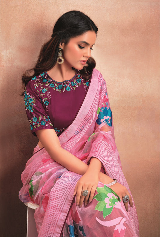 Pure Organza Pink Saree with Digital Print and ...
