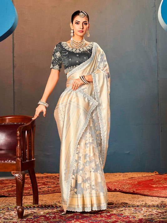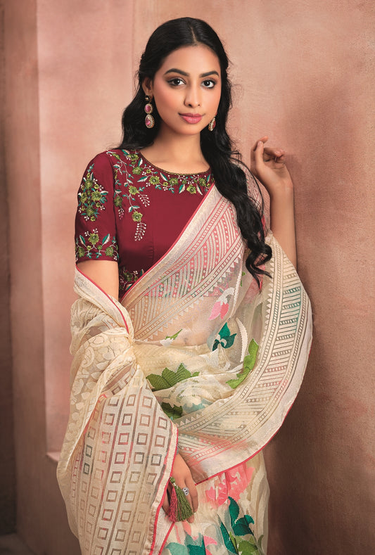 Cream Pure Organza Saree with Digital Print and...