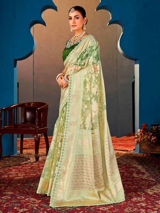 Pista Green Pure Organza Saree with Digital Flo...