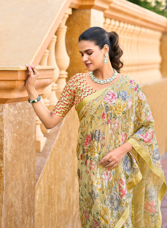 Pale Yellow Floral Pure Brasso Saree with Satin...