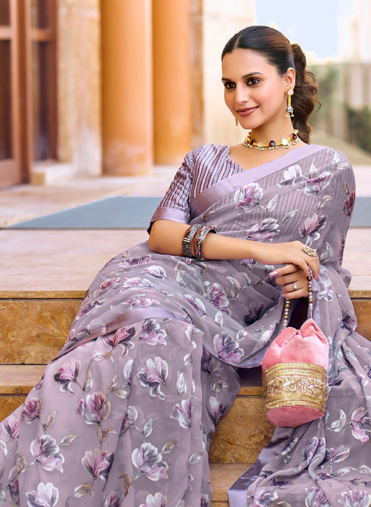 Lavender Grey Floral Pure Brasso Saree with Sat...