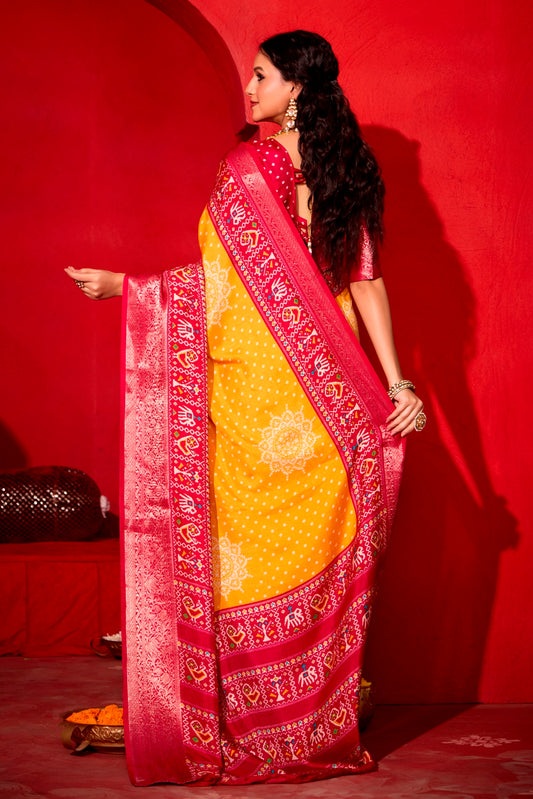 Pure Silk fabric with Turmeric Yellow and Red D...
