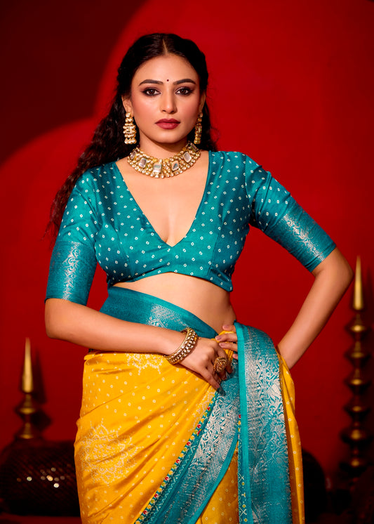 Pure Silk fabric with Lemon Yellow and Turquois...