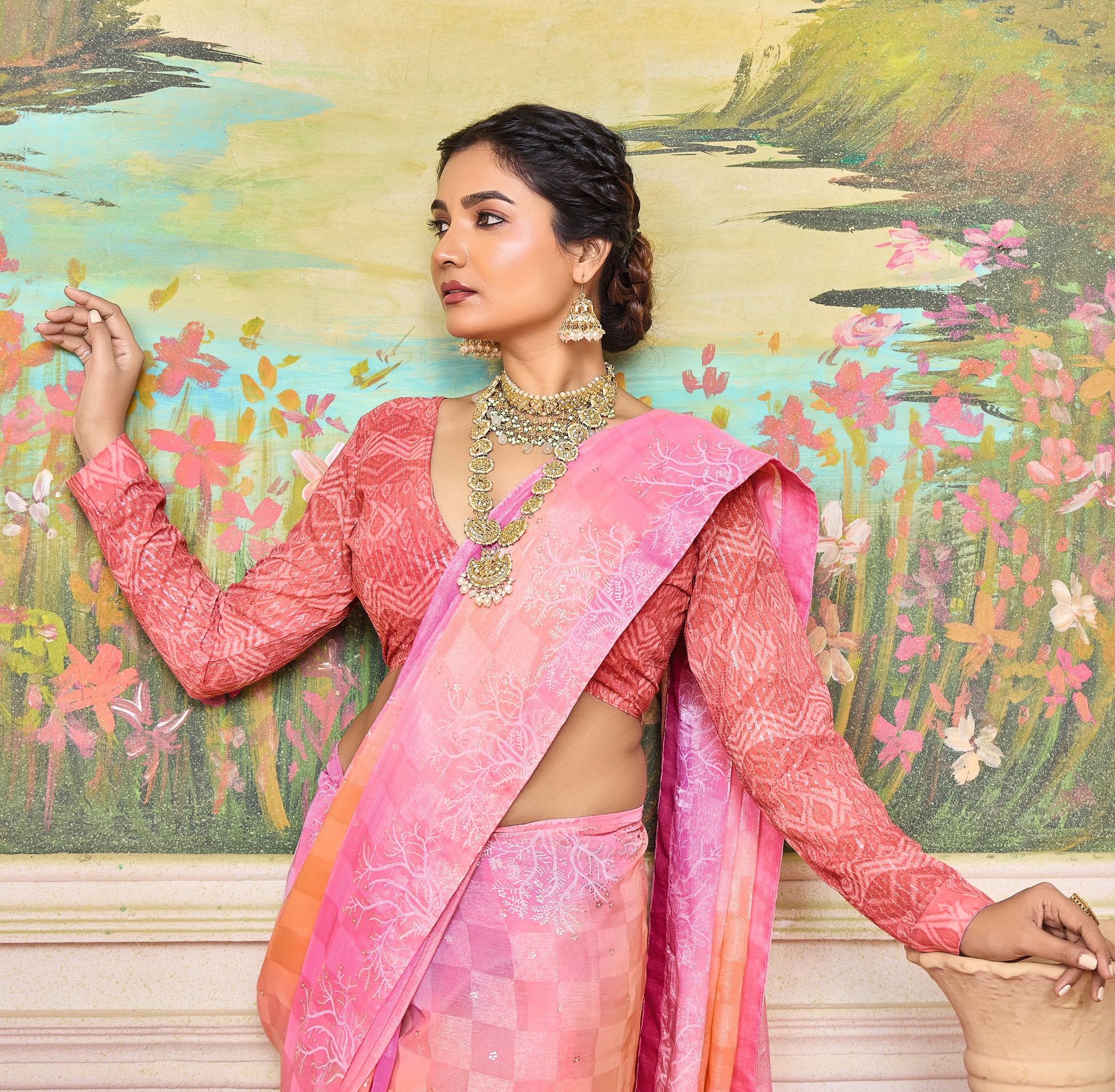Charming Pink and Peach Brasso Saree with a Checkered Design and Delicate Embroidery with Heavy Sequence Blouse Perfect for Festive and Special Occasions