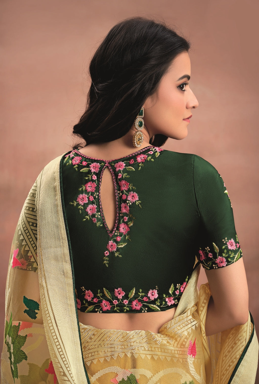 Golden Beige Pure Organza Saree with Digital Print with Heavy Dark Green Embroidered Blouse