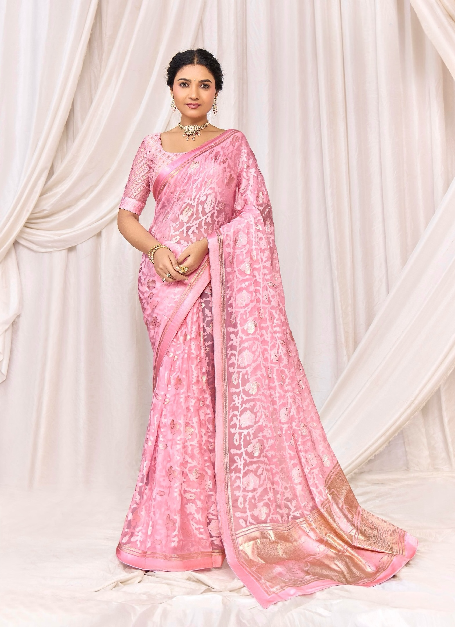 Pure Brasso fabric with Exclusive Baby Pink colored Designed with Featuring Interactive Gold & Silver Foil Touch with Rich Traditional Border Ideal for Day to Evening Events.