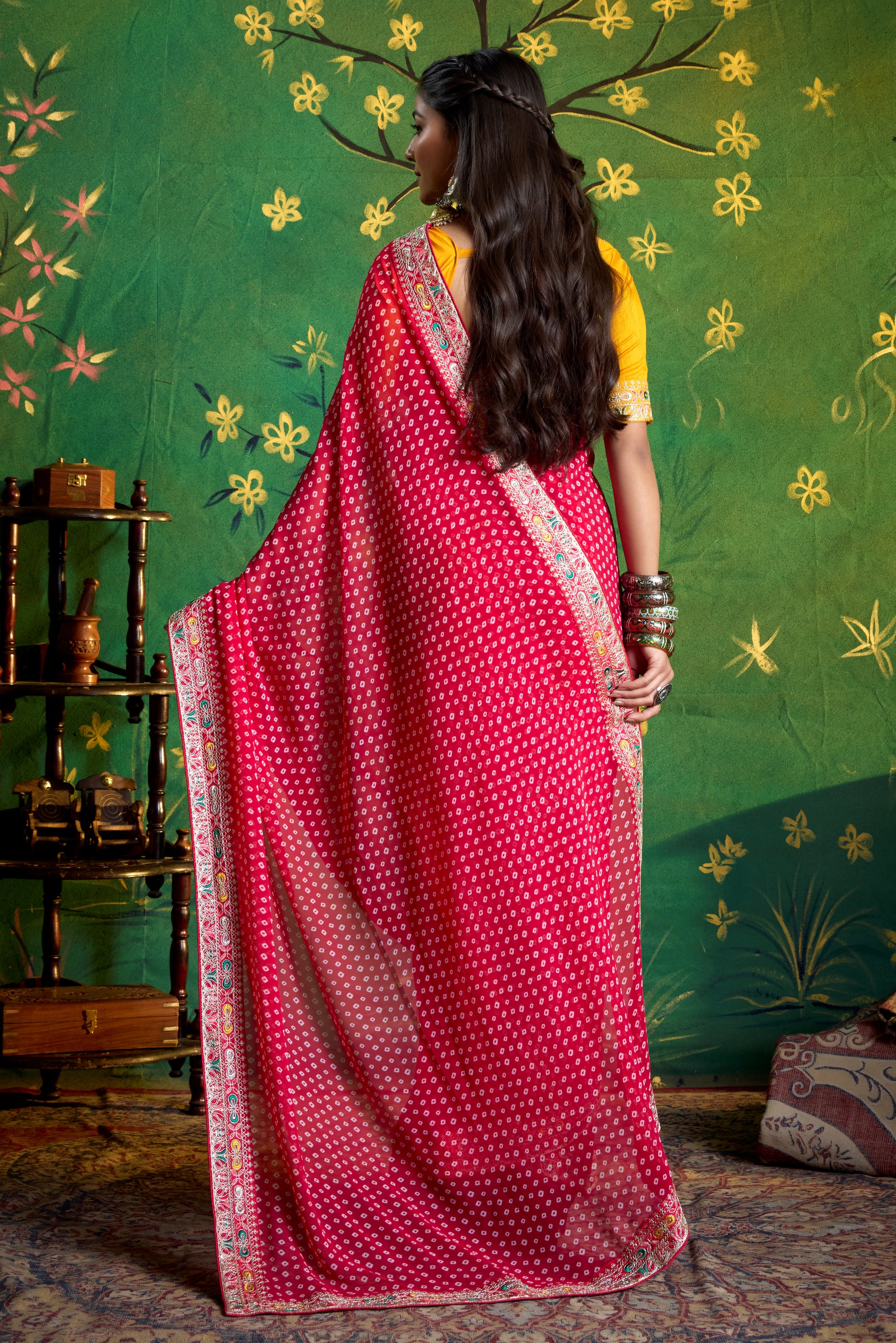 Pure Bamber Georgette Bandhej Saree with Deep Pink Combination and Hand Work Multicolored Zardozi Border with Heavy Contrast Embroidered blouse
