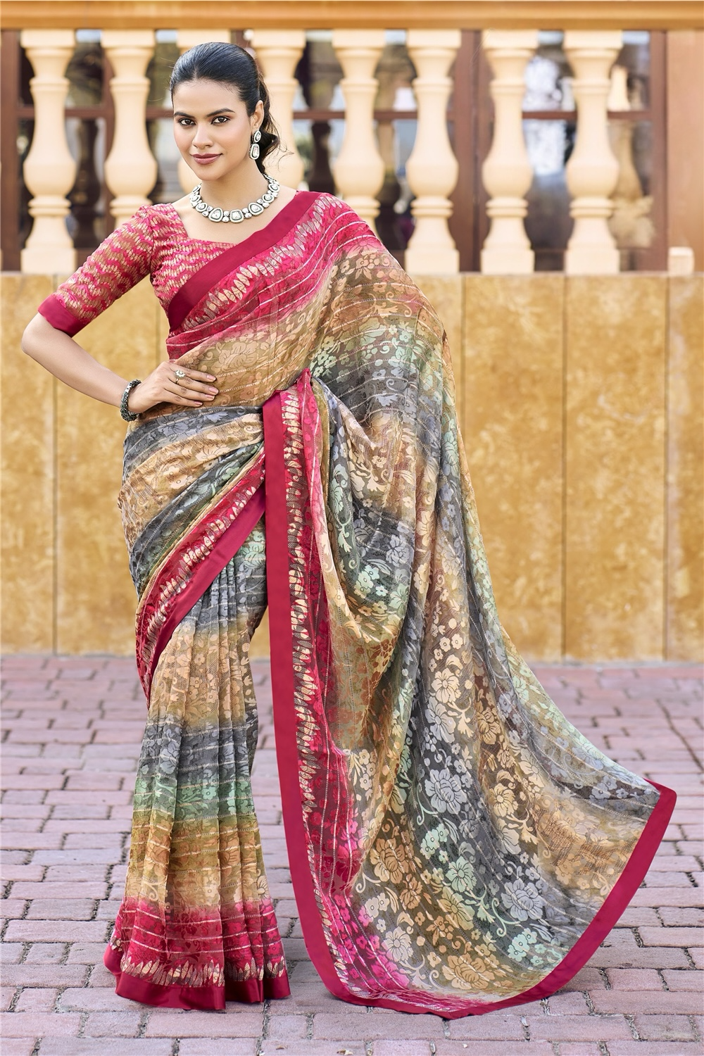 Multicolor Striped Floral Pure Brasso Saree with Contrast Maroon Border – Festive Party Wear Lightweight Saree with Matching Designer Blouse Piece
