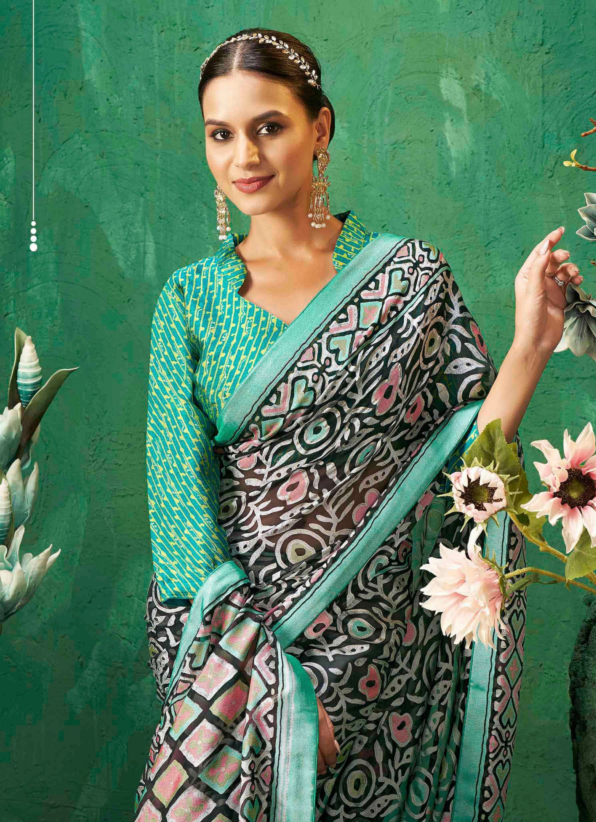Saree - Exclusive Brasso Fabric with Aqua & Black Color Digital All over Print and Foil Touch with Burnout Design.